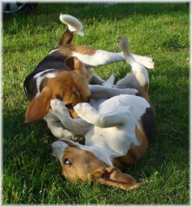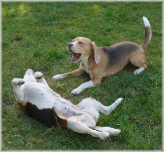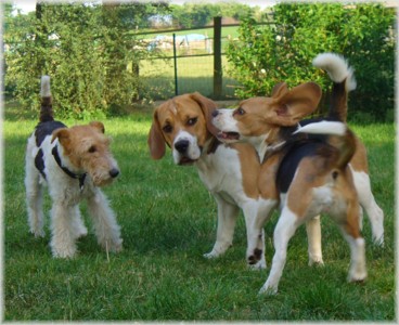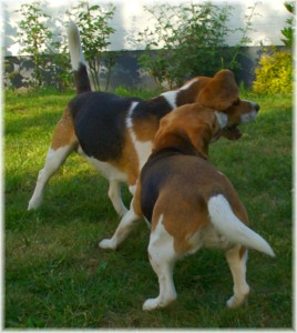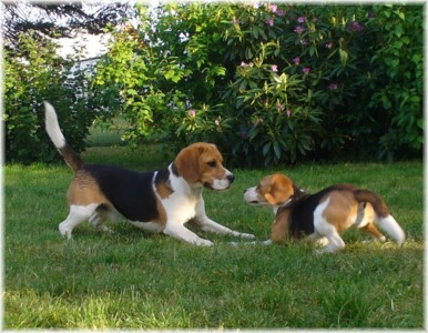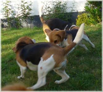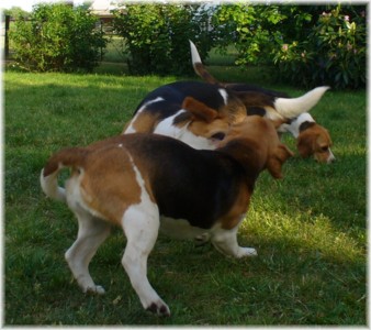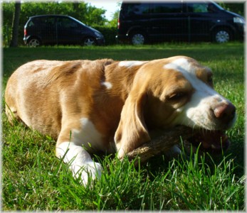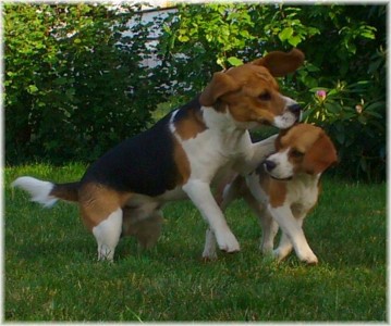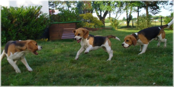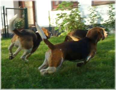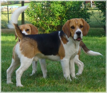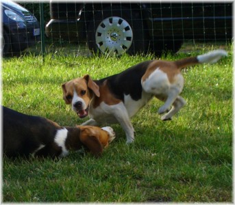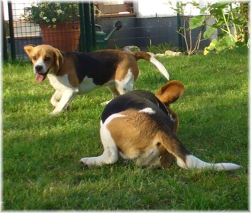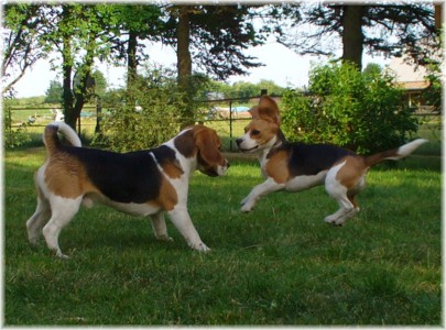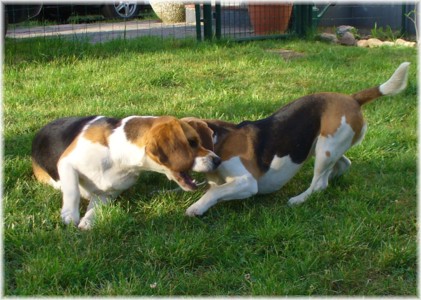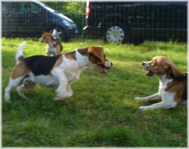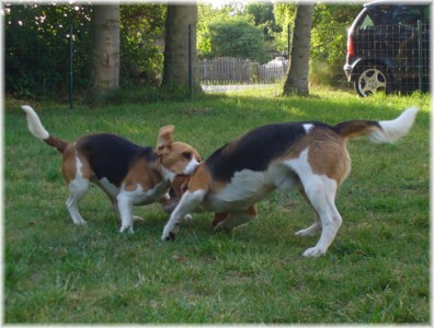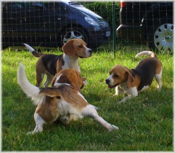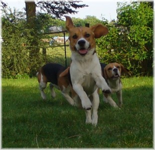 Wie schon die letzten Jahre war es am 30. Mai wieder soweit: Ich packte das Auto, lud Quincy und Beamie ein, fuhr Richtung Berlin nach Hohen Neuendorf, um auch Bruce mitzunehmen, und weiter ging es nach Schleswig Holstein. In Klein Vollstedt warteten schon Anja und Martin nebst Glimmchen und Barclay und kurz nach mir kamen auch Dani und Marko, mein Stephan und Ehrenbeagle Tory (ihres Zeichens Fox Terrier) an. Das Wochenende wurde in fröhlicher Runde eingeläutet, standen uns ja zwei Tage in den Holsten-Hallen Neumünster bevor. Samstag stand für uns nur Agility auf dem Plan: Martin mit Barclay, Marko mit Tory und ich mit Quincy nahmen am Super Hallen Masters teil, ein zweitägiges Hallenturnier auf Teppich, bei dem am Sonntagabend die jeweiligen Sieger der drei Größenklassen im A 3 gekürt werden. Das Wetter meinte es gut mit uns, zum Glück war unsere Halle etwas klimatisiert, was bedeuten soll, dass es draußen noch heißer war. Die Wartezeit nutzten wir für Shopping und Beamie konnte beim Windhund-Coursing zeigen, wie laut sie "brüllen" kann ;-). Ich nutzte die Zeit weiterhin für etwas Ringtraining mit Bruce, er sollte schließlich am Sonntag gezeigt werden. Wirklich notwendig war es nicht, in ihm schlummert der geborene Showhund, der sich fast selbst stellt, sich nicht stressen läßt und die ganze Zeit gut gelaunt bleibt. Abends wieder in Klein Vollstedt kam noch Caro mit Caja und Amy dazu und unsere Runde war komplett. Während es sich die Zweibeiner bei Bier und Gegrilltem gut gehen ließen, nutzten die Hunde die kühleren Abendstunden zum Toben. Lediglich die Agi-Hunde wurden etwas zeitiger ins "Bett gebracht", um am Sonntag ausgeruht zu sein. Sonntag hatte ich dann Doppelprogram: Agility und Ausstellen (diesmal aber "nur fremde" Hunde). Anderson und Bruce sollten von Herrn Derscheid begutachtet werden. Da der Beaglering neben dem Agility war, konnte man gut beides im Auge behalten. Bruce zeigte sich für einen fast ungeübten Hund wirklich schön und bekam ein vorzüglich und den 3. Platz von 5 Rüden in der Jugendklasse. Wenig später stand ich mit Anderson im Ring. Seine Familie war extra mit ihm angereist, weil ihm für die Zuchtzulassung noch die Bewertung von einem deutschen Richter fehlte. Ein "sehr gut" reicht uns heute ... mit dieser Einstellung gingen wir diese Show an. Und wie es dann so ist, unverhofft kommt oft: Anderson gewinnt die Gebrauchshundklasse mit V 1 VDH-Cha. Ich hätte auch gerne mit Jasmin und ihrem Fredo getauscht, der mit dem V 2 wieder knapp den Championtitel verfehlt hat ;-) aber umso stärker drücken wir die Daumen für Fredos kommende Shows. Andersons Familie war aber überglücklich, endlich das doch heimlich langersehnte V 1. Rene, Heide und Steffi: wir freuen uns ganz doll mit Euch! Ihr habt soviel Arbeit in Anderson gesteckt, die ganzen Ratschläge versucht so gut wie möglich umzusetzen und seid dafür endlich belohnt worden. Macht weiter so! Ich weiß ja, für Euch ist Anderson der Größte und dass ist auch gut so. In der Zwischenzeit lief es beim Agility durchwachsen. Caro war sehr froh, dass ihre Caja in der Halle lief und das war viel wichtiger als der ein oder andere kleine Patzer auf dem Parcours. Im Jumping waren sie sogar platziert! Martin und Marko kamen mit ihren Hunden jeweils einmal fehlerfrei durch. Beide Tage hatten sie leider in dem ein oder anderen Lauf etwas Pech und eine kurze Unachtsamkeit endete dann im DIS. Richtig gut lief das ganze Wochenende für mich und Quincy, so bestritten wir als die einzigsten Starter im A 3 Medium 6 Läufen ohne auch nur einen Parcourfehler mit folgenden Platzierungen: 2 x 2., 1 x 5., 1 x 6., 1 x 7. und 1 x 9. von insgesamt 11 Teams. Für jedes Team zählten die 4 besten Platzierungen als Punkte, die für den Einzug ins Finale gewertet wurden. Und dank seiner kontinuierlich guten Leistung hat es Quincy tatsächlich ins Finale der besten 4 geschafft. Das Finale als seinen 7. Lauf an diesem heißen Wochenende bestritt er dann nochmal fehlerfrei und zügig. Allerdings nicht zügig genug um mit den anderen 3 Finalhunden (1 Manchester Terrier, der auch im WM-Team ist, 1 Sheltie und 1 Berger de Pyrenès) mithalten zu können. Aber das macht nichts, ich meine wir haben uns wacker geschlagen und Quincy hat fast immer alles gegeben. Insgesamt war das ein wirklich schönes Wochenende, mit lieben Menschen und tollen Hunden. Ich hoffe sehr, das nächstes Jahr wiederholen zu können! Ein großes Dankeschön an Janet, die uns ihren Bruce anvertraut hat. Er ist so ein lieber, fröhlicher Kerl, hat sich nur von seiner besten Seite gezeigt und war durch nichts zu beeindrucken; einfach nur toll! | ||||||||||||||||||||||||||||||||||||||||||||||||||||||||||||||||||||||||||||||||||||||||||||||||||||