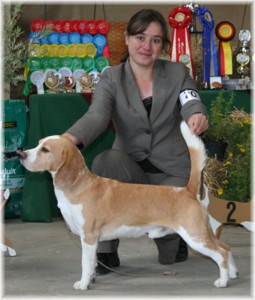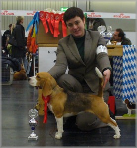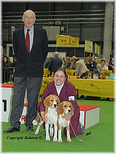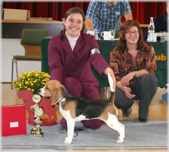 Erfolgreicher Start für uns ins Ausstellungsjahr 2007: Auf der CACIB in Offenburg (10.03.07), Richterin ist S. Weber aus der Schweiz, gewinnt Arsenal die Jugendklasse der Rüden mit V 1, VDH-CHA-Jgd.; Quincys Tochter Glimmer Blue vom Sturmgeläut bekommt ebenfalls V 1 und VDH-CHA-Jgd. bei den Hündinnen in der Jugendklasse. Charisma startet in der Zwischenklasse und erhält ein V 2, VDH-CHA-Res. und dann noch CAC-Reserve und CACIB-Reserve. Ihre Zuchtzulassung hat sie damit auch in der Tasche ;-). Nach diesen Erfolgen im Beagle-Ring ging es aber noch weiter, denn ich zeigte Nally und Charisma dann noch beim Paarklassenwettbewerb im Ehrenring. Bei Dr. Peper haben sie es aus unglaublichen 16! Paaren der verschiedensten Rassen auf den 3. Platz geschafft. | |||||||||||||||||||||||||||||||||||||||||||||||||||||||||||||||||||||||||||||||||||||||||||||||