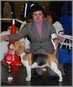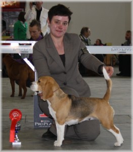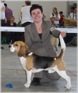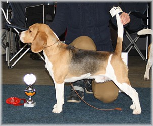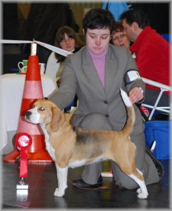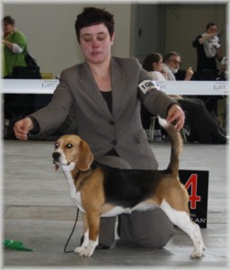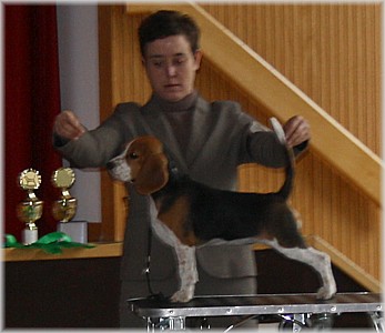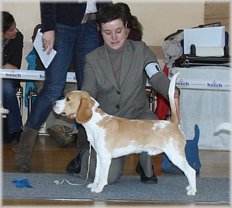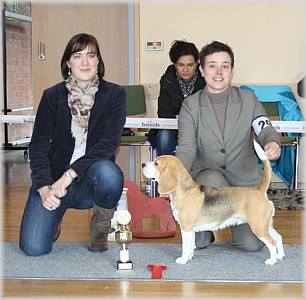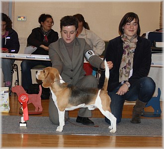 Vor dem ganzen "Prüfungsstress" war gestern (2.4.11) aber endlich wieder Showtime. Auf der CACIB in Berlin hatte ich wieder mal ordentlich zu tun;). Von unseren eigenen Hunden war nur Yucca mit, Bruce (Familie Berger, Hohen Neuendorf) war natürlich auch mit von der Partie und dazu kamen dann noch Derby (Familie Schulze, Scheuder) und Easy (Familie Szyszka, Passow). Die Ergebnisse können sich sehen lassen: In der Championklasse bekam Bruce von 5 Rüden den tollen 2. Platz und Yucca bei den Hündinnen (leider als Einzelkämpferin) den logischen 1. Easy (LD Big Easy) hatte in der Jugendklasse die größte Konkurrenz und da sie auch nicht trainiert ist, hatte ich Schwierigkeiten den Wirbelwind zum Stillstehen zu bringen. Da ist noch Übungsbedarf! - über die vorzügliche Bewertung freue ich mich selbstverständlich trotzdem sehr. Gleich im Anschluss war dann Derby (LD Derby County) in der Zwischenklasse an der Reihe. Sie ließ sich wirklich "easy" handeln, machte ihre Sache richtig gut und bekam das V 4. Das I-Tüpfelchen des Tages war dann Pelle (LD Everton), der mit Frauchen und Herrchen vorbeischaute. Wir finden, er hat sich vielversprechend weiter entwickelt und haben auch Zeit für ein kleines Fotoshooting >>> gefunden. Es war insgesamt ein sehr schöner Tag im und am Ring und unser großer Dank geht an unsere engagierten Welpenkäufer und vor allem an Janet und Mathias für das liebe Beaglehüten. | ||||||||||||||||||||||||||||||||||||||||||||||||||||||||||||||||||||||||||||||||||||||||||||||||||||||